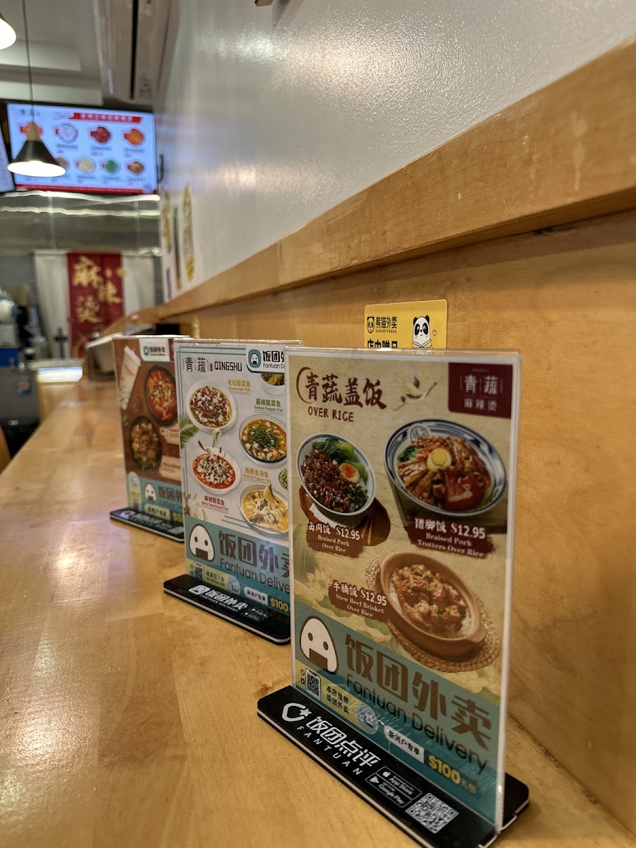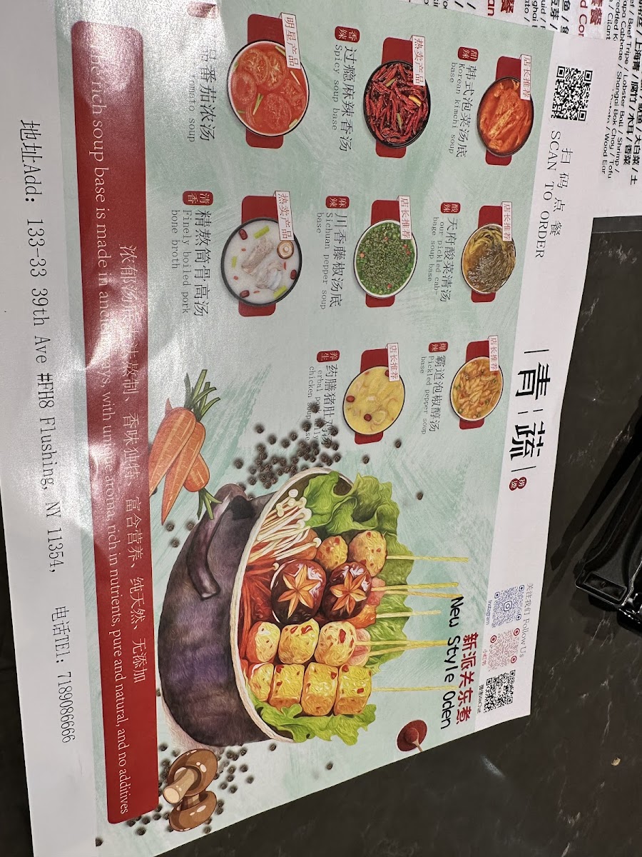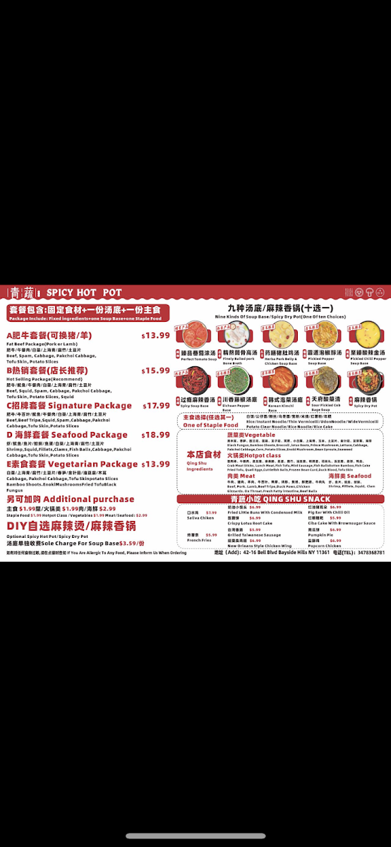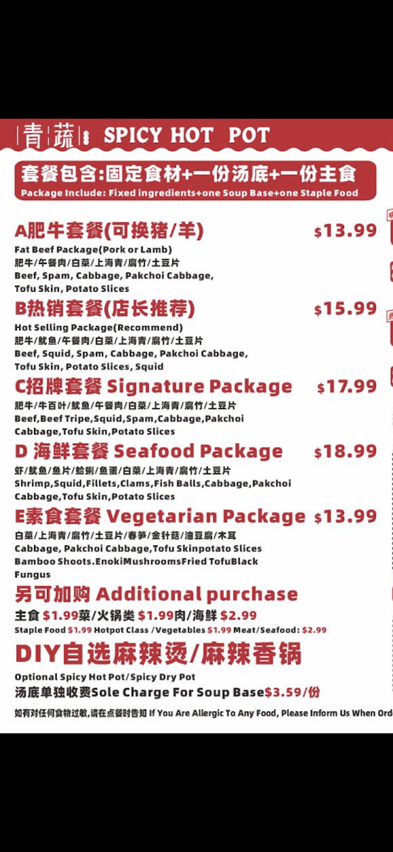 Shrimp, Squid, Fish Fillet, Clams, Fish Balls, Fish Tofu, Crab Cabbage,Pakchoi Cabbage, Tofu Skin, Potato Siices, and choice of staple food.附虾, 鱿鱼, 鱼片, 蛤蜊, 鱼蛋, 鱼豆腐, 蟹条,白菜,上海菜,腐竹,土豆片及主食选项。