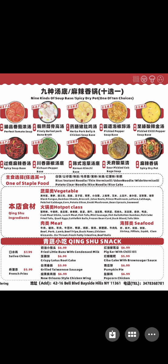 The menu at Qing Shu Spicy Hot Pot offers a diverse selection of flavorful dishes that cater to different preferences. For those craving a customizable experience, the DIY Spicy Hot Pot and DIY Spicy Dry Pot allow you to create your own hot pot or dry pot, featuring a variety of fresh ingredients. The restaurant also highlights several new arrivals, including Boiled Beef In Spicy Broth and Dry-Pot Frog Legs, providing unique and spicy options. For a complete meal, their Spicy Hot Pot Packages like the Signature Spicy Hot Pot Package and the Pork Spicy Hot Pot Package offer satisfying combinations. Those seeking a spicy dry pot can choose from options like the Pork Spicy Dry Pot Package or the Seafood Spicy Dry Pot Package. The Qing Shu Snack section offers tantalizing bites such as Grilled Taiwanese Sausage and Fried Shrimp Balls, perfect for a side or appetizer. For a lighter option, the Milk Tea choices like Yan Yan Milk Tea provide a refreshing drink to pair with your meal. The Sauerkraut Fish Menu includes the beloved Fish With Pickled Vegetable In Golden Soup and the spicy Laotan Sauerkraut Fish, perfect for fans of tangy and savory flavors. Finally, the Combo Packages are ideal for sharing, featuring a variety of dishes like the Double Package that includes rice, snacks, and drinks. Whether you're in the mood for a hearty meal or a spicy treat, Qing Shu Spicy Hot Pot offers something for every taste.